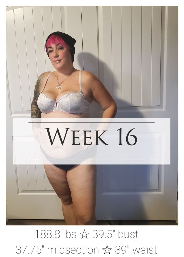 I’m down just a pound this week, but I’ve carved off more than an inch from my bust, half an inch off my hips and another inch and a half off my tummy for a total of 14.25 inches off my midsection since I started four months ago. See? Something worth smiling for. There always is.
