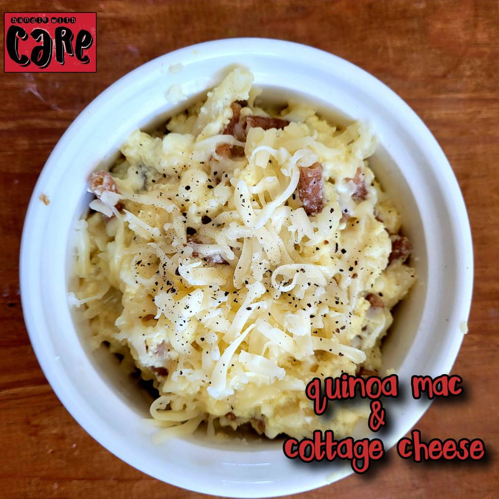 In a saucepan, combine and heat 3/4 cup cottage cheese with 1 tbsp of minced garlic until very warm. Add 1/2 cup of Quinoa macaroni noodles. Stir until noodles are soft.